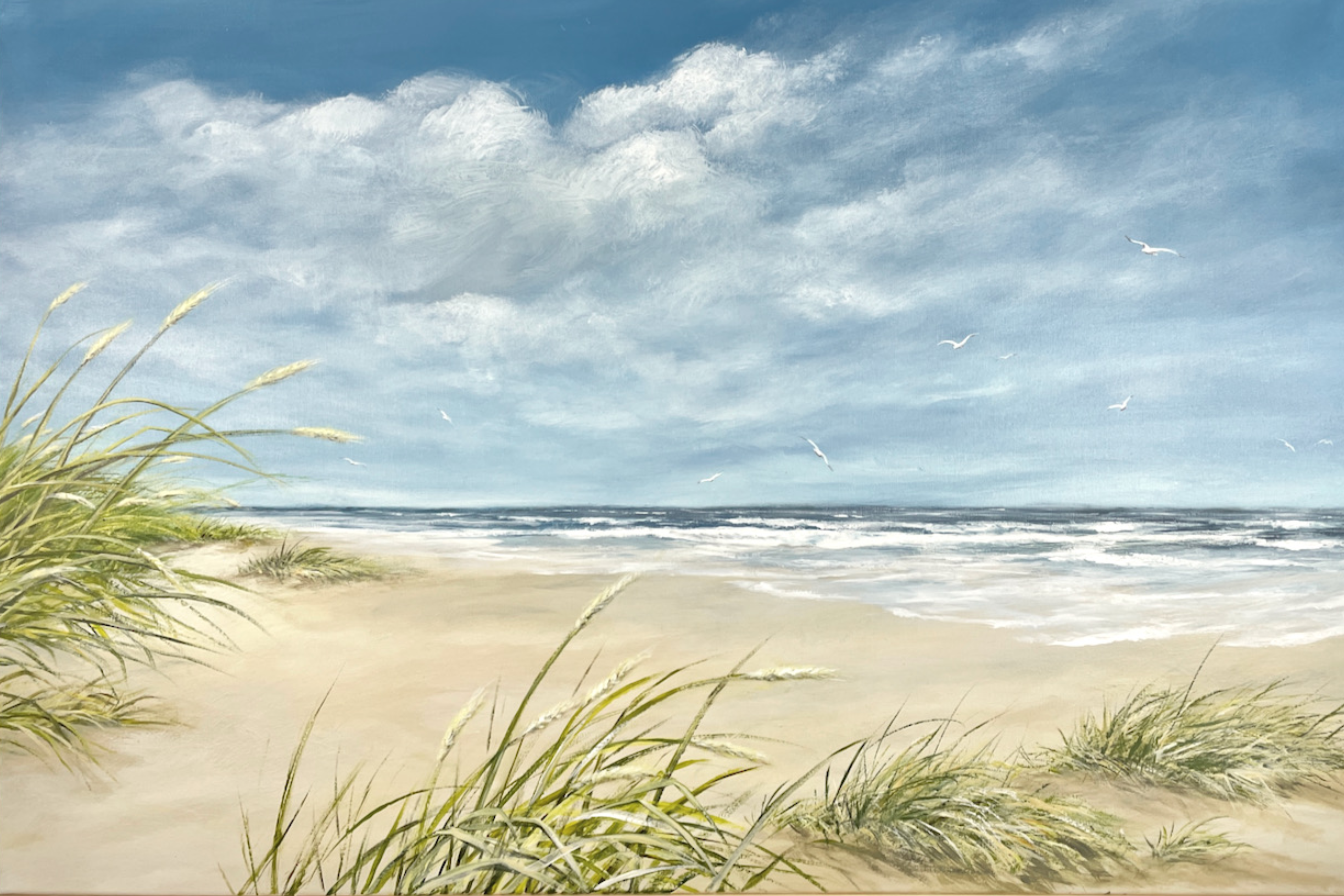 Jochen Kröger hat in Kiel Malerei studiert, an seiner Staffelei entstehen maritime Bilder von klein bis groß. Dünen, Wind und Wellen - ein Stück Strandurlaub für Dein Zuhause.