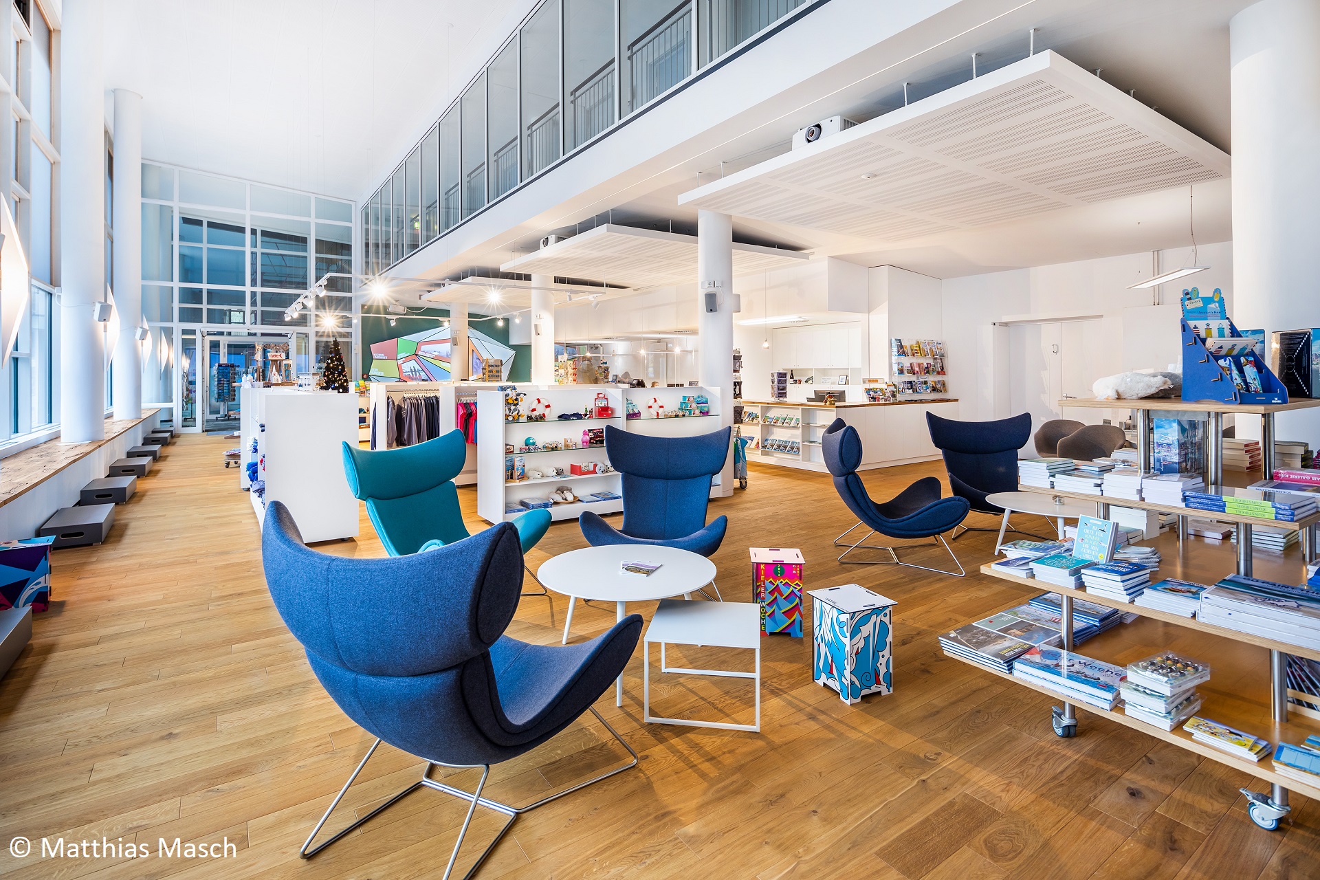 Der lange Beratungstresen sowie die Beratungstische bieten reichlich Platz für das Tourismus-Team, die Besucherinnen ausführlich zu beraten, Buchungen vorzunehmen und die neuen digitalen Angebote zu präsentieren. Im Souvenirshop erhalten Sie viele maritime Andenken: vom Kühlschrankmagneten bis zum Kieler Hafen-Sweatshirt. Der Media-Bug ist ein zentrales Element im neuen Welcome Center für die großflächige Darstellung digitaler Formate. Der Bug bildet, wie der Begriff schon sagt, die „Spitze“ in der Verlängerung des Eingangs. Verfolgen Sie auf der imposanten 12 Meter breiten Leinwand eine virtuelle Fahrt auf der Kieler Förde oder erleben Sie Kiel in 3D. Hierbei bewegen Sie sich mit dem Controller oder einer interaktiven Karte durch Kiel! Beim Pop-Up Möbel Eisberg handelt es sich um ein einzigartiges, vieleckiges Möbelobjekt dessen einzelne Flächen für Projektionen und Präsentationen genutzt werden können. Die Eisberg-Form stellt einen Hinweis auf Kiel als Meeresschutzstadt mit einer nachhaltigen Entwicklung dar. Der Eisberg steht also sinnbildlich für die Notwendigkeit unsere Umwelt zu schützen und Maßnahmen zum Umweltschutz zu ergreifen. Auf den Projektionsflächen können sich die Besucherinnen über die 17 Umwelt-und Entwicklungsziele der Landeshauptstadt Kiel informieren.